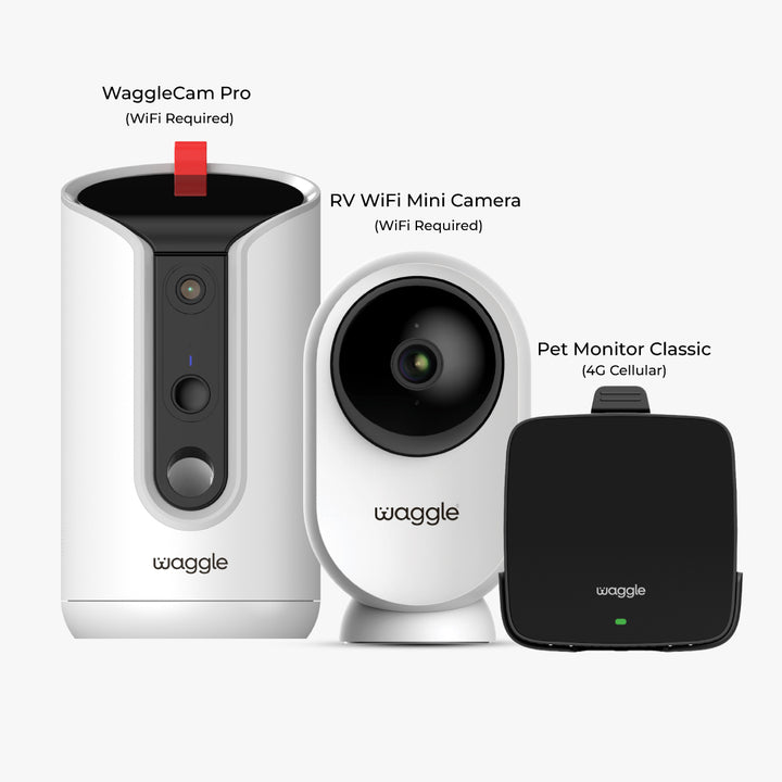 This pack includes Pet Monitor Classic (runs on 4G and requires a network plan), WaggleCam Pro and RV WiFi Mini Cam – both operate on Wi-Fi. Together, they provide full-circle coverage for your pet and RV.